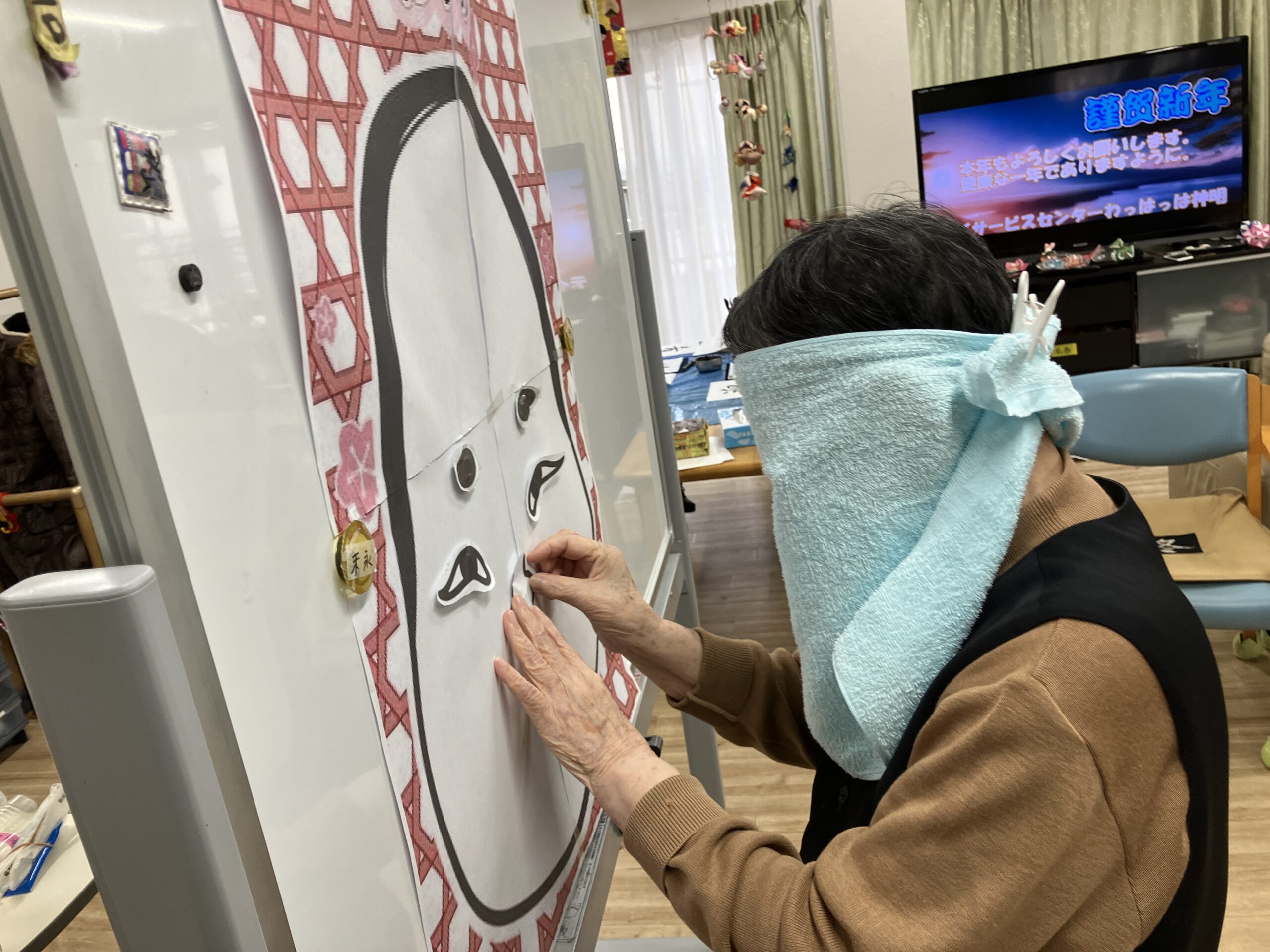 昼食はこの日限定で簡単なおせちを用意したのと共に、午後からはお正月恒例の「書き初め」「福笑い」も実施し、